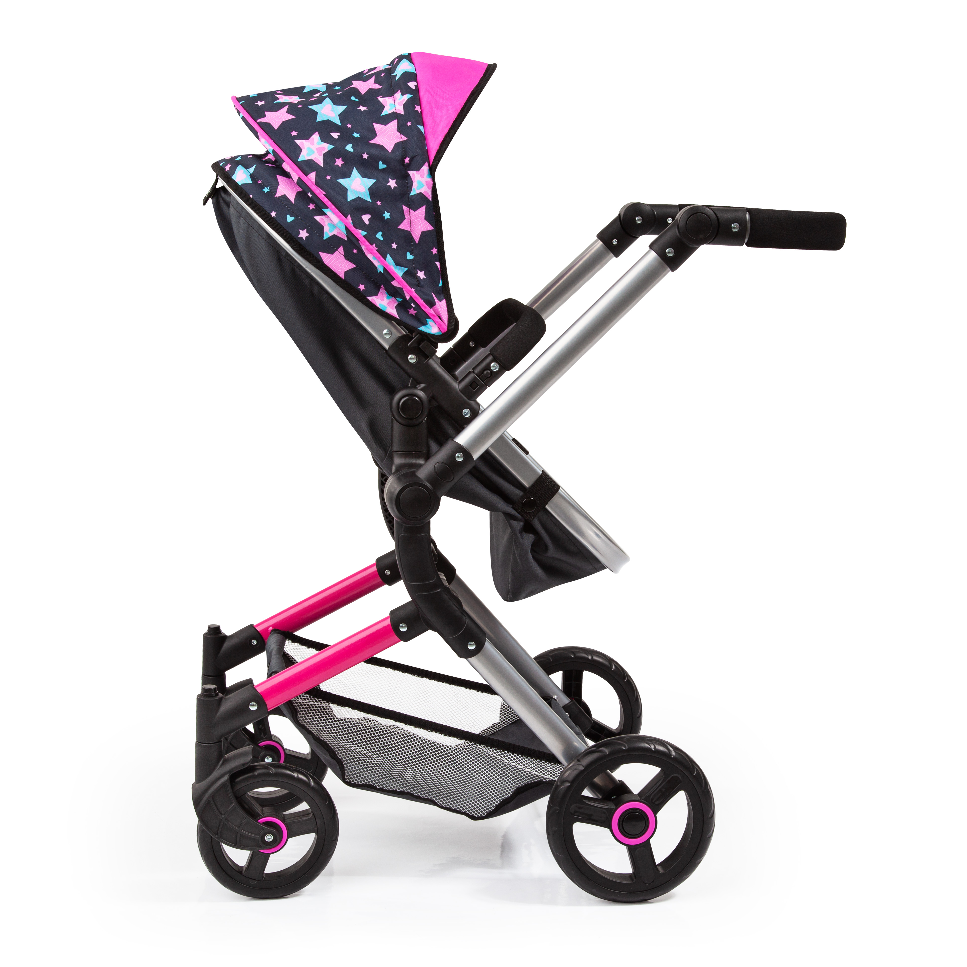 The Neo Vario combi doll's pram, designed for dolls up to 52 cm, features an adjustable handle (62 - 79 cm) for easy adaptation to a child's height. The carrycot can be mounted facing either direction, and the reversible handle allows movement on both sides. The angle of the carrycot is adjustable, converting the pram into a jogger pushchair. A carrier’s cover protects the doll from sun and wind in any position. With pivoted front wheels, it ensures stable cornering. This foldable pram includes a versatile bag with a long handle for shoulder carrying and two short handles for hand carrying, plus a zipper for secure closure. The integrated shopping basket offers additional storage space.